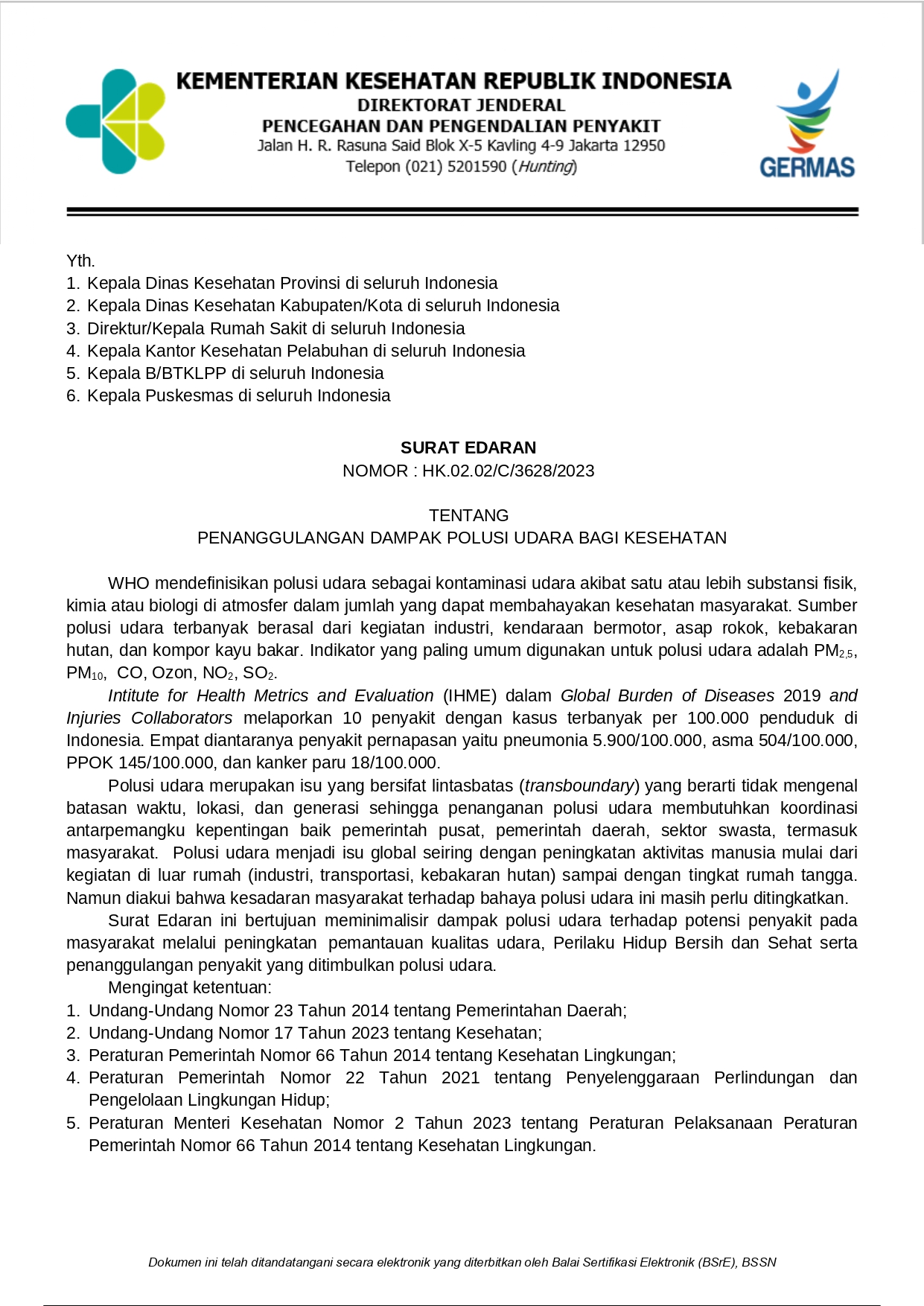 DikesPohuwato – Kementerian Kesehatan RI melalui Direktorat Jenderal Pencegahan dan Pengendalian Penyakit menerbitkan Surat Edaran (SE) nomor: HK.02.02/C/3628/2023 tentang Penanggulangan Dampak Polusi Udara Bagi Kesehatan. Surat Edaran ini ditujukan kepada dinas kesehatan provinsi, kabupaten/kota, direktur rumah sakit, kantor Kesehatan Pelabuhan, B/BTKLPP, dan puskesmas.