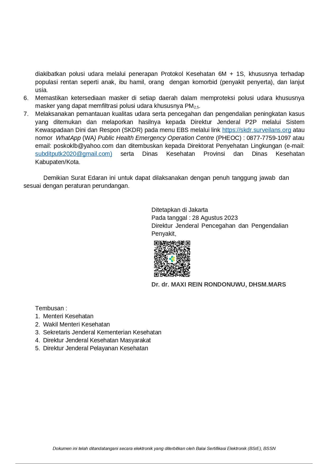 Ketujuh, melaksanakan pemantauan kualitas udara serta pencegahan dan pengendalian peningkatan kasus yang ditemukan dan melaporkan hasilnya kepada Direktur Jenderal P2P melalui Sistem Kewaspadaan Dini dan Respon (SKDR) pada menu EBS melalui link https://skdr.surveilans.org atau nomor WhatApp (WA) Public Health Emergency Operation Centre (PHEOC) : 0877-7759-1097 atau email: [email protected] dan ditembuskan kepada Direktorat Penyehatan Lingkungan (e-mail: [email protected] ) serta Dinas Kesehatan Provinsi dan Dinas Kesehatan Kabupaten/Kota.