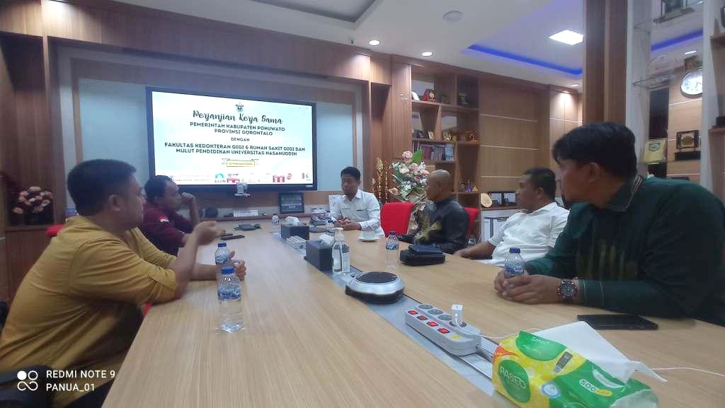 PKS tentang pengembangan Sumber Daya Manusia, Kesehatan Dokter dan Dokter Spesialis Mulut dan Gigi dilakukan Dekan Fakultas Kedokteran Gigi Universitas Hasanuddin, Irfan Sugiantono bersama Direktur Rumah Sakit Gigi dan Mulut Pendidikan Universitas Hasanuddin , Andi Tajrin dengan Kepala Badan Kepegawaian Pengembangan Sumber Daya Manusia Kabupaten Pohuwato, Supratman Nento, Kepala Dinas Kesehatan Kabupaten Pohuwato, Fidi Mustapa, Direktur Rumah Sakit Umum Daerah Bumi Panua Kabupaten Pohuwato, Yeni Ahmad di FKG Unhas, Makassar, Sulawesi Selatan.
