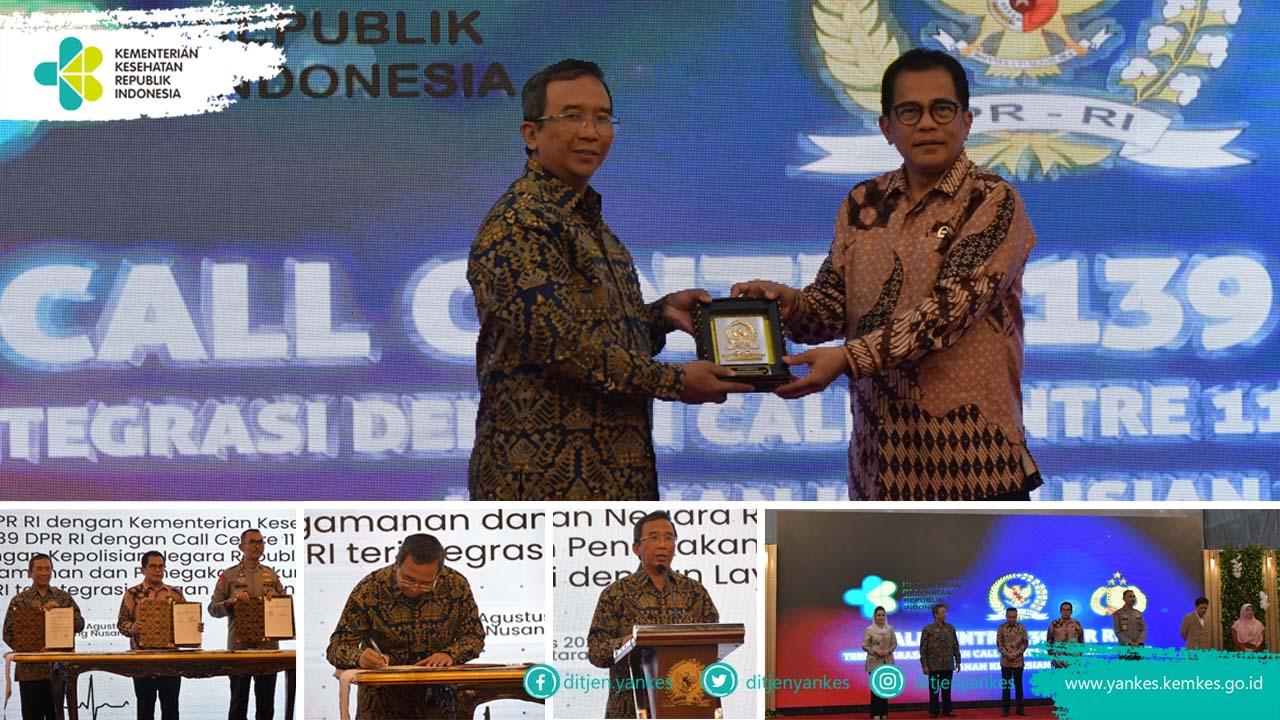 DikesPohuwato – Sekretariat Jenderal DPR RI bersama Kementerian Kesehatan melakukan penandatanganan Nota Kesepahaman Integrasi Layanan Kesehatan berbasis Call Center 139 DPR RI dan 119 Kementerian Kesehatan RI. Direktur Jenderal Pelayanan Kesehatan dr. Azhar Jaya, SH, SKM, MARS dan Sekretaris Jenderal DPR RI Dr. Ir. Indra Iskandar, M.Si menandatangani Nota Kesepahaman tersebut, yang disaksikan langsung Wakil Ketua DPR RI Prof. Dr. Ir. H. Sufmi Dasco Ahmad, SH, MH.