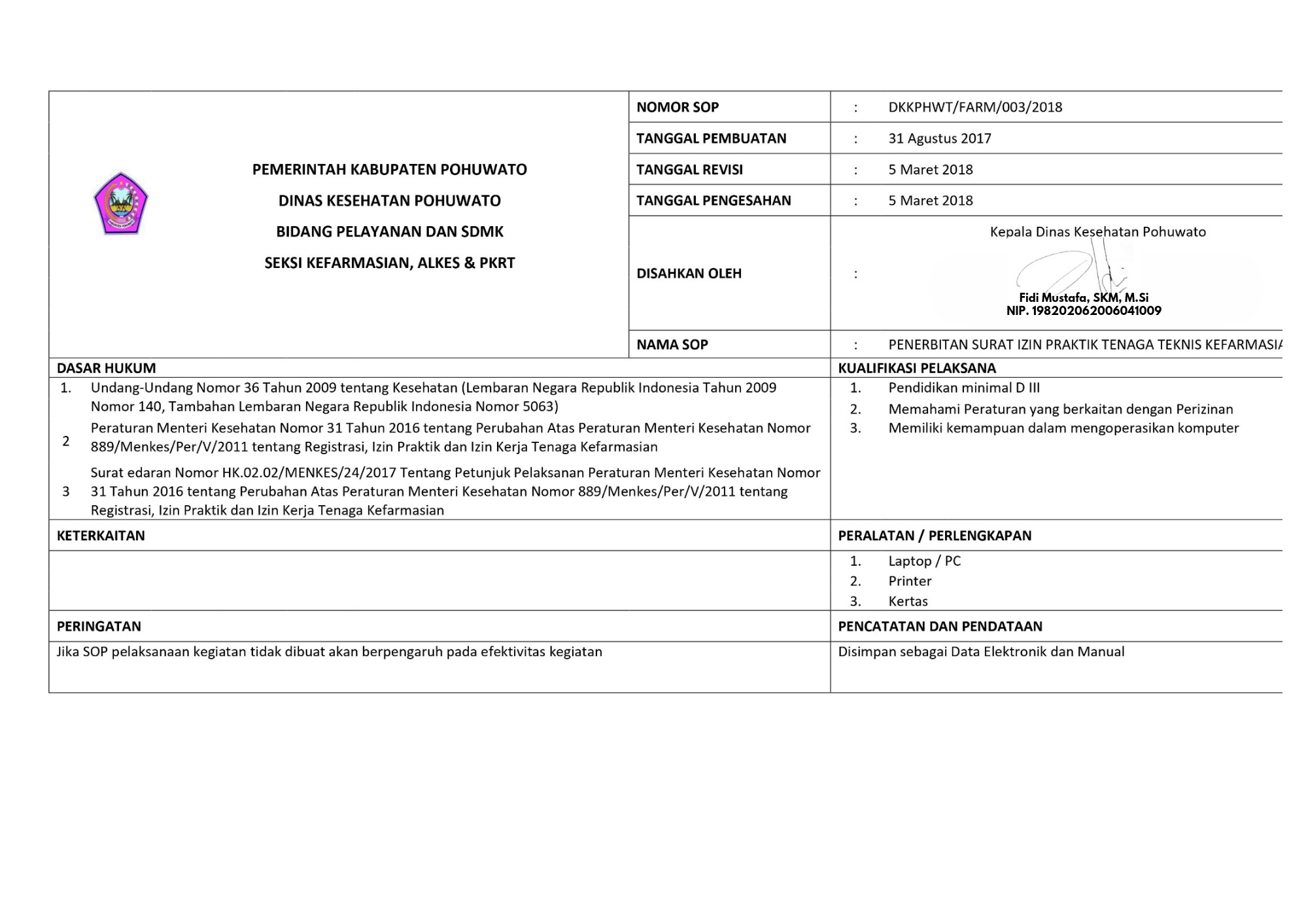 SOP PENERBITAN SURAT IZIN PRAKTIK TENAGA TEKNIS KEFARMASIAN